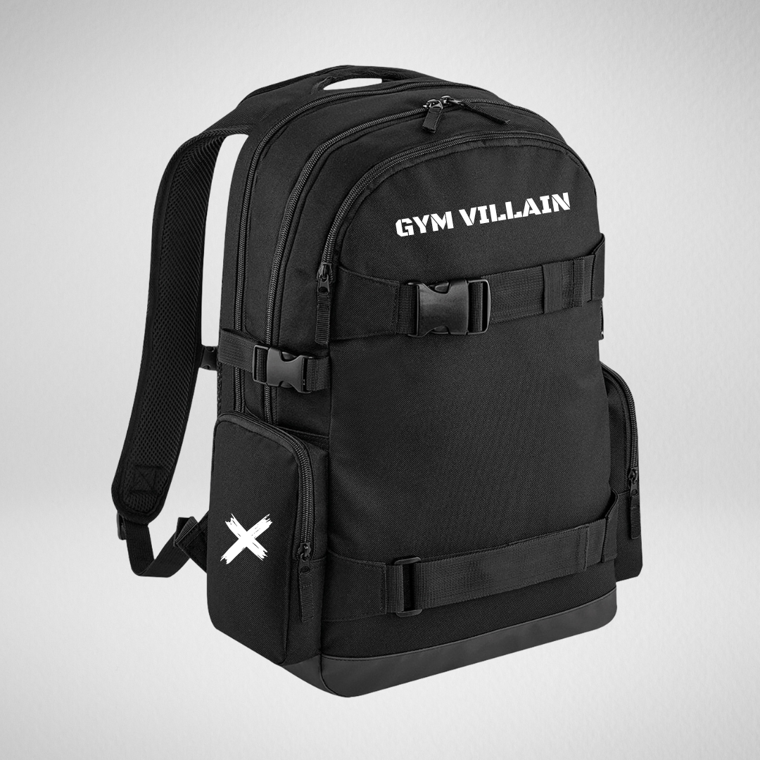 Our Villain Backpack is designed for a multi purpose use. External access padded laptop compartment. Skateboard carry straps. Internal organiser section. Zippered front pocket. Zippered side pockets. Padded back panel. Compression straps. Padded adjustable shoulder straps. Grab handle